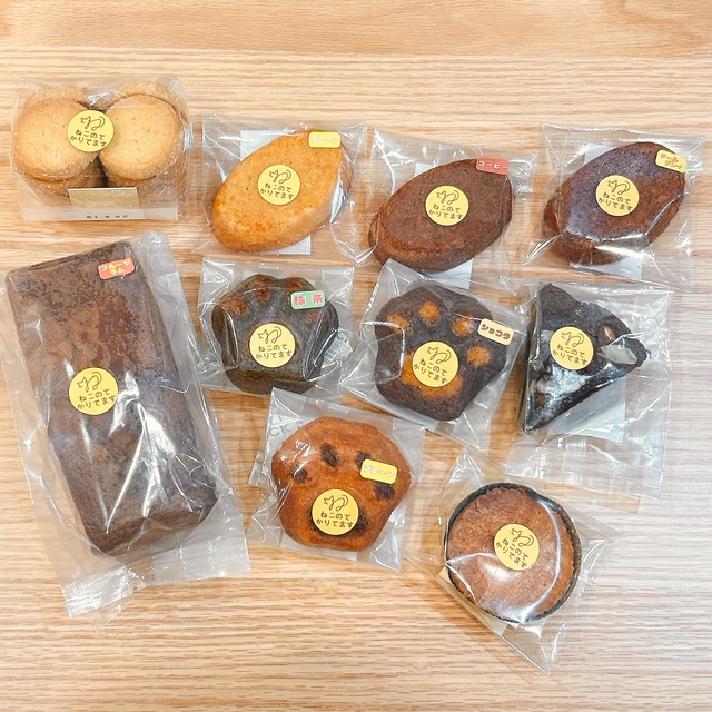 ねこのてかりてますの商品10種セットです。 ・ねこのてマドレーヌ(プレーン、ショコラ、抹茶) ・小判フィナンシェ(プレーン、アールグレイ、コーヒー) ・パウンドケーキ(フルーツラム) ・クッキー(プレーン) ・ガレットブルトンヌ ・ブラウニー ※小麦、卵、乳成分、アーモンド、カシューナッツ、クルミを含む ギフトボックスサイズ 約187×190×67(㎜) パウンドケーキサイズ 約60×130×60(㎜) マドレーヌサイズ 約6センチ