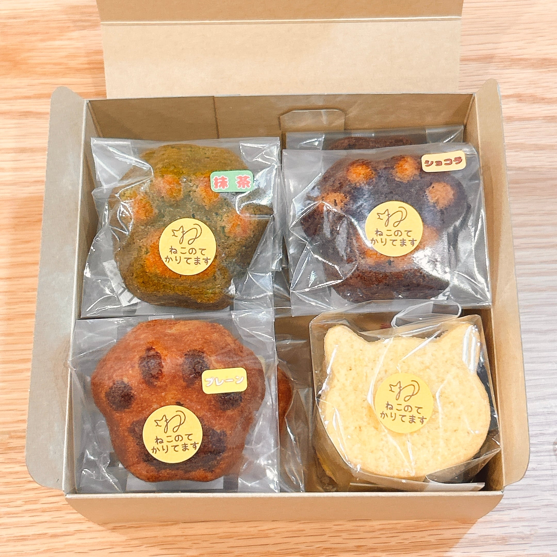 ねこのてマドレーヌ6個(プレーン×2ショコラ×2抹茶×2)とねこサブレ(10枚入)のセットです。