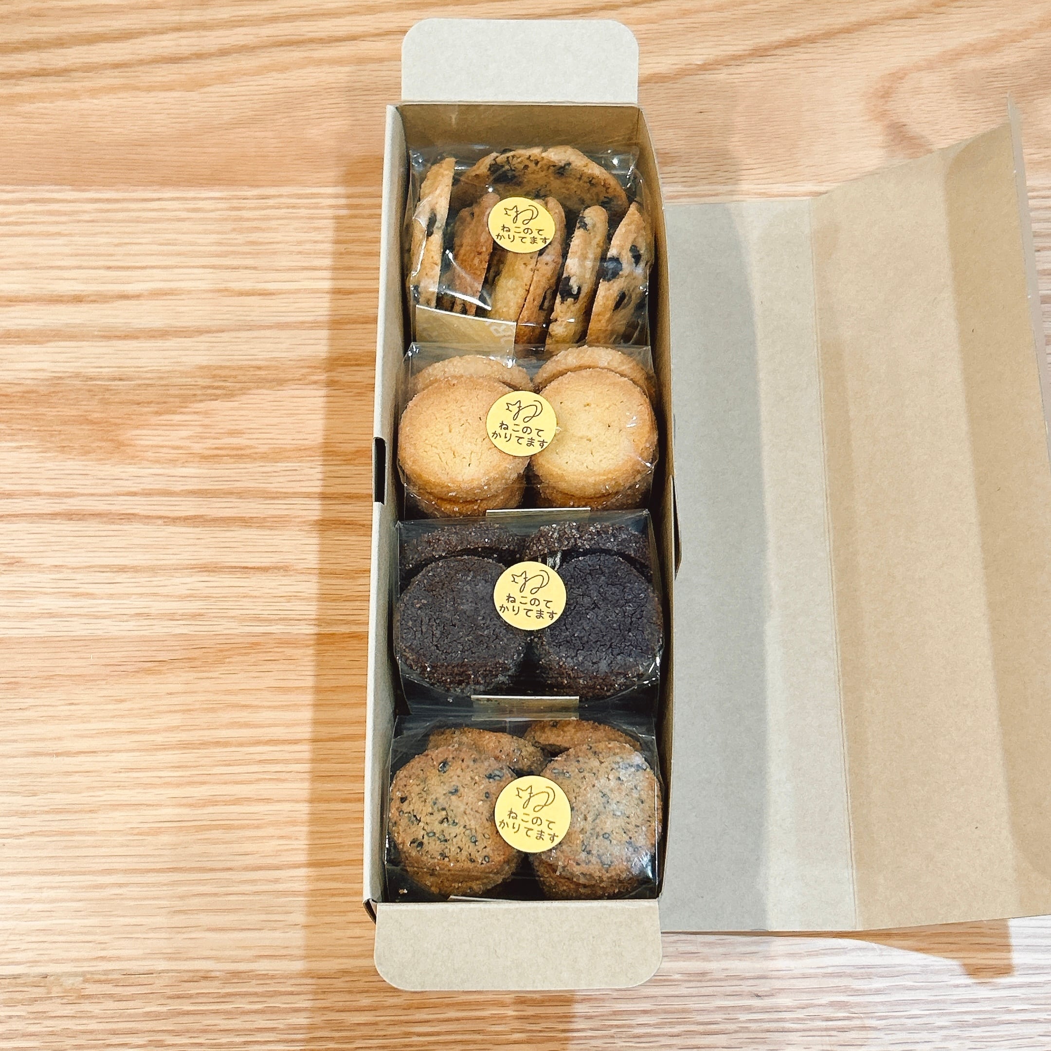 どの味もしっかり濃いめなクッキー4種(プレーン、ショコラ、ゴマチーズ、チョコチップ)のセットです。